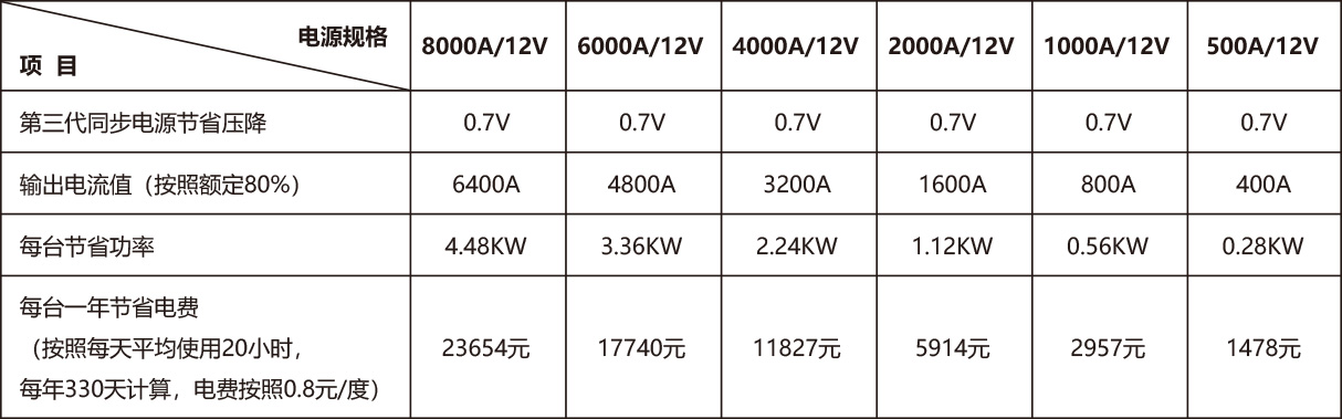 Adopt new rectifier mode and rectifier devices, device voltage drop 0.1V-0.2V rectification efficiency greatly improve energy saving and electricity saving.