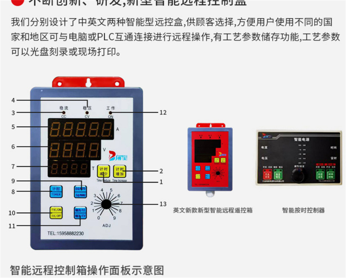 | 保护 | 具备过流、过压、超温、短路、缺水(水冷)、缺相等自动保护报警功能 | |