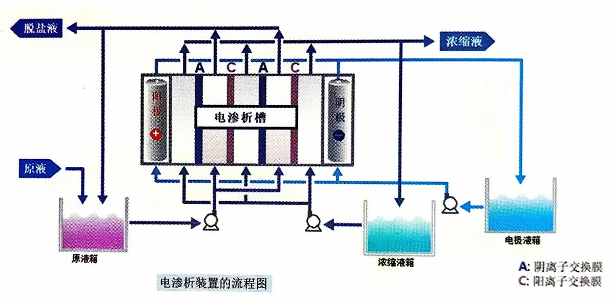 电渗析技术是一种电化学分离过程,在直流电场作用下,利用离子交换膜对溶液中离子的选择透过性,使阴离子和阳离子发生定向迁移,从而实现水溶液中带电离子的脱除或浓缩。